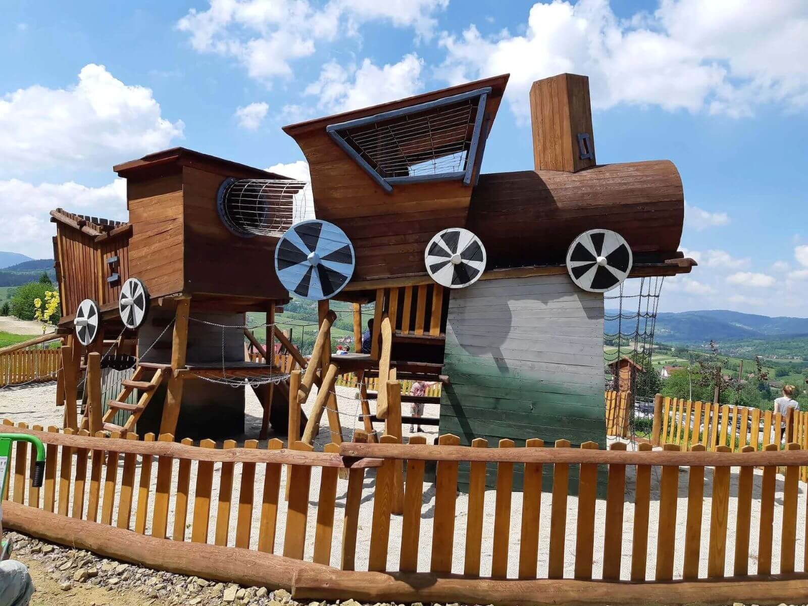 The playground for the youngest visitors is built from natural materials, with a standout feature: a charming retro-style train installation.