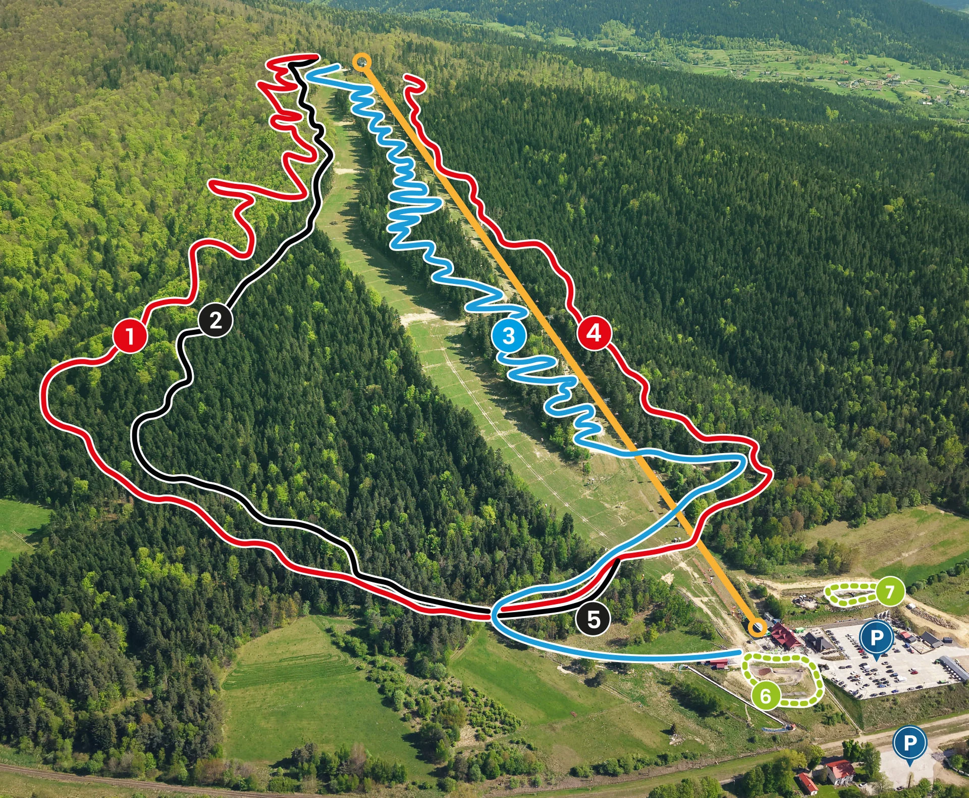 | 2 | BLACK DH CUP | 1740 m | czarna | Trasa expert Trasa w 90% naturalna wybudowana ręcznie Przeszkody typu: gap, drop, progi, kamienie, korzenie, trawersy Większe przeszkody posiadają objazdy Szybka, stroma i techniczna |